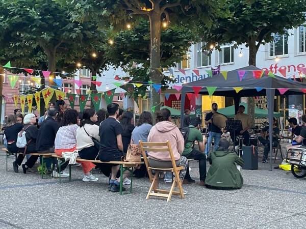 Zum Abschluss trat die Band Koma Bezar unter Fahnen und Lichterketten auf. Es wurde noch einmal viel getanzt. „Es war ein langer aber schöner Tag“, kommentierte eine der Organisator:innen das Jugendfestival in Frankfurt.