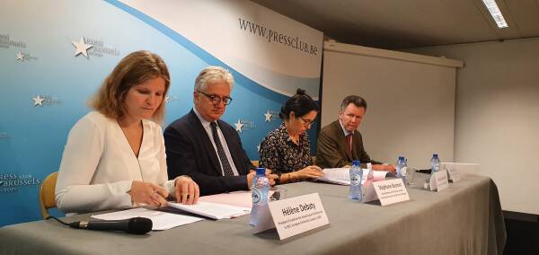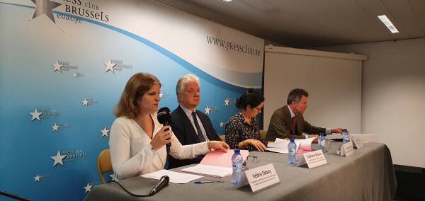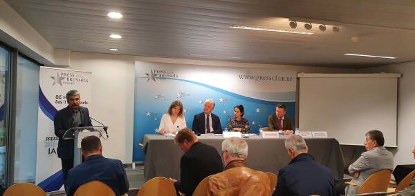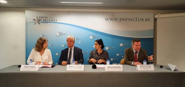 Redner:innen auf dem Podium im Brüsseler Presseclub waren Hélène Debaty, Präsidentin der Union der Anwält:innen für Demokratie (SAD) und Mitglied der European Democratic Lawyers (AED), Selma Benkhelifa vom Brussels Progressive Lawyers Network, Stéphane Boonen, Direktor der belgisch-deutschen und französischen Anwaltskammern, und Maurice Krings, ehemaliger Präsident der Brüsseler Anwaltskammer.
