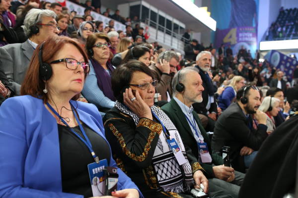 Nach der Eröffnungsrede wurden die HDP-Abgeordneten Tülay Hatimoğulları und Mehmet Rüştü Tiryaki zum Versammlungsvorsitz gewählt. Hatimoğulları wies in einer Ansprache auf die Zustände im Land hin. Die Politikerin erklärte, dass die Menschenrechtslage katastrophal sei und Freiheiten immer weiter eingeschränkt werden. „Das Leben wird für die Völker immer unerträglicher. Die Armut vertieft sich und die Gewalt gegen Frauen nimmt zu. Die Mentalität, die Grundlage für die Lösungslosigkeit der kurdischen Frage ist, ist in Form von Kriegen auch in Syrien und dem Irak zu spüren und übt Gewalt gegen die Völker aus. Wir als die Unterdrückten dieses Landes sind aber nicht hilflos. Die Lösung liegt in der Einheit der Völker und dem Bündeln unserer Kräfte. Ich grüße alle Menschen, die von Imrali bis Kandira und Edirne in den Kerkern dieses Landes Widerstand leisten“, sagte Hatimoğulları.