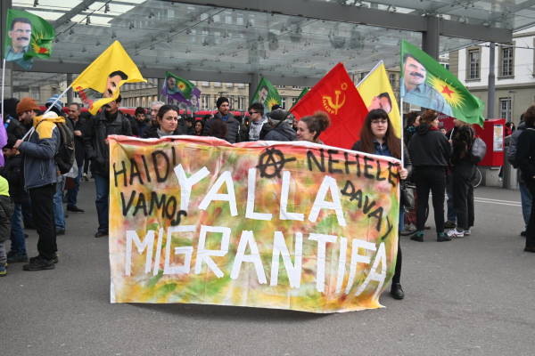 Die Aktion begann mit einer Schweigeminute auf dem Bahnhofvorplatz. In einem Redebeitrag wurde die Politik der Schweiz und anderer Staaten Europas gegen Migrant*innen verurteilt. „Menschen, die vor Rassismus und Faschismus nach Europa geflohen sind, sind hier derselben Gewalt ausgesetzt“, hieß es in einer Erklärung.