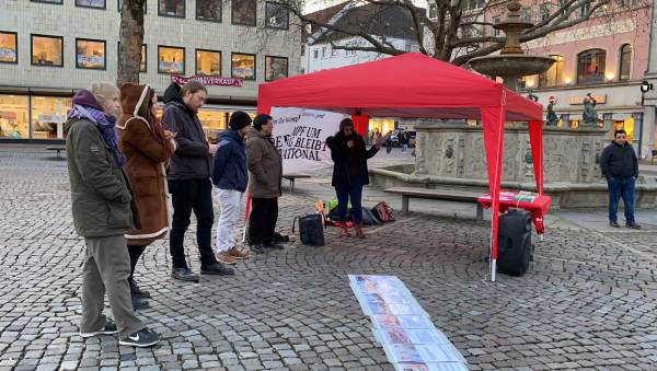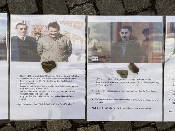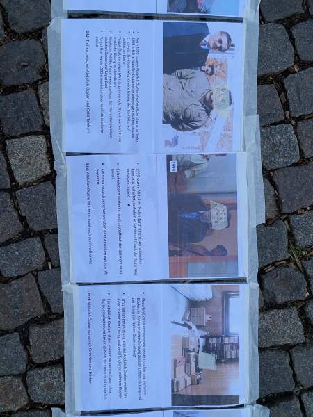 „Wir sind recht zufrieden mit der Aktion. Die Menschen sind sehr offen und interessiert. Leider haben wir mit krassen Repressionen zu kämpfen. Wir stehen hier, um die Freilassung eines politischen Gefangenen zu fordern, aber wir dürfen das Bildnis dieses Gefangenen nicht zeigen! Die Polizei hat es uns verboten. Sie wollen hier einem Menschen das Gesicht, die Identität nehmen. Zuerst verbieten sie über Umwege seine Bücher, jetzt wollen sie ihm das Gesicht nehmen. Eine Frechheit. Ein Kniefall der Bundesregierung vor dem türkischen Faschismus! Aber wir kämpfen weiter”, so das Fazit einer Aktivistin.