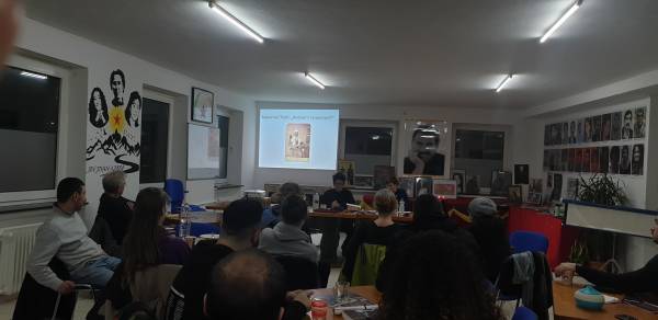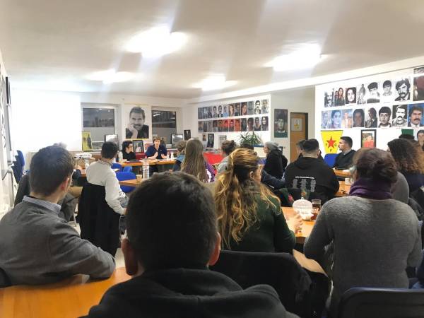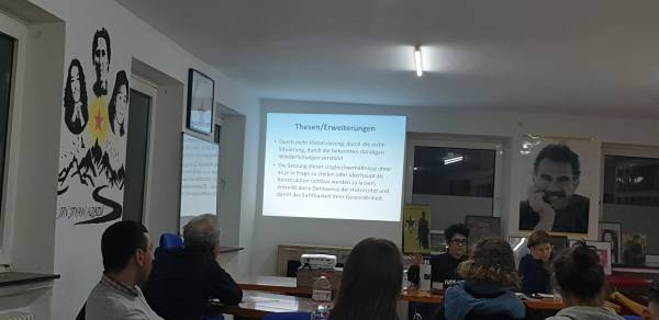 Nach dem etwa einstündigen Vortrag gab es eine lebhafte Diskussion über die Interpretation von Öcalans Schriften sowie über die Begriffe „Natur“ und „Aufklärung“.