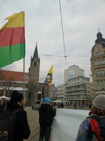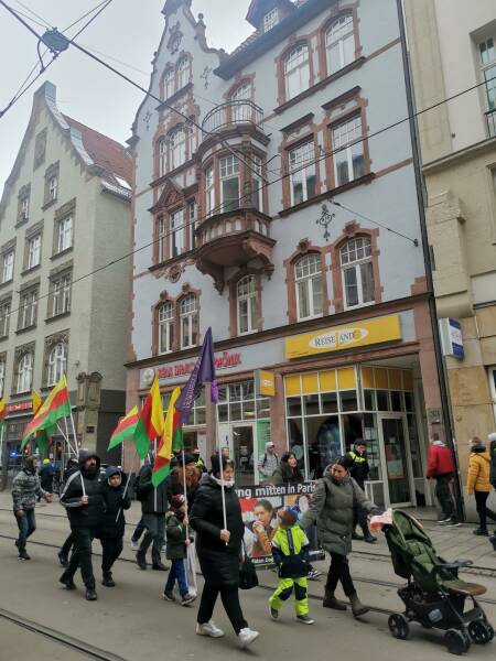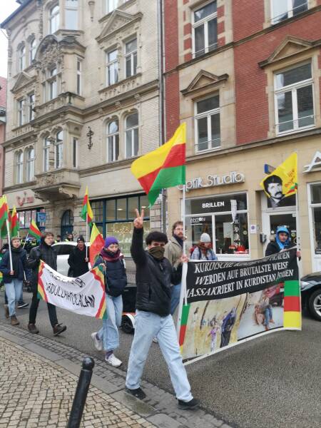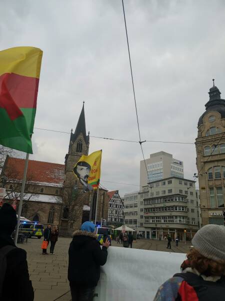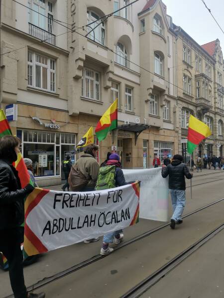 In Erfurt gingen am Samstag etwa 50 Personen auf die Straße, um lautstark die Freiheit für den kurdischen Vordenker Abdullah Öcalan zu fordern. Vor 26 Jahren wurde Abdullah Öcalan im Rahmen eines internationalen Komplotts inhaftiert und wird seitdem in Isolationshaft auf der Gefängnisinsel Imrali in der Türkei festgehalten - abgeschirmt von der Öffentlichkeit und die meiste Zeit ohne jeden Kontakt zu Anwält:innen oder Angehörigen. Trotz seiner Isolationshaft ist er bis heute eine wichtige Inspirationsquelle für die kurdische Bevölkerung.