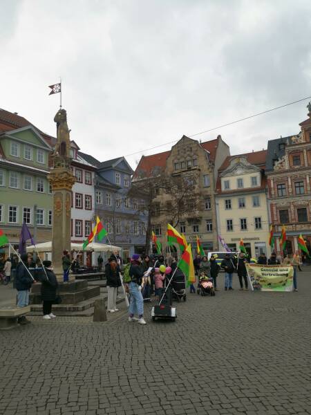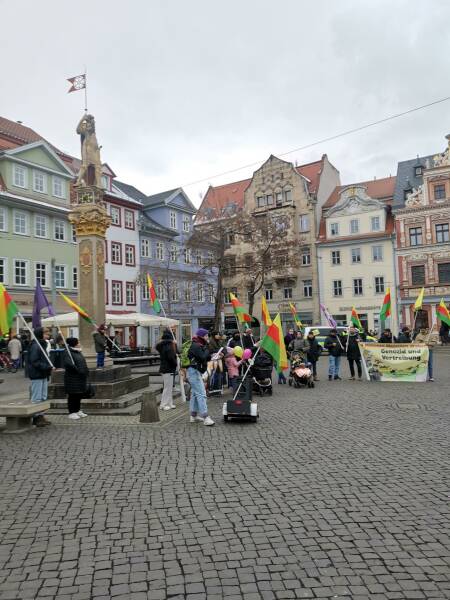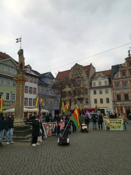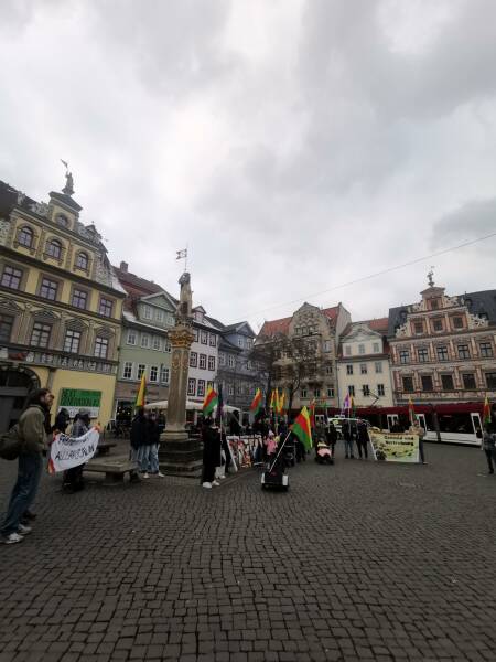 Die Aktivist:innen machten auch auf die aktuelle politische Situation in Nordostsyrien aufmerksam und verurteilten den fortlaufenden Angriffskrieg der Türkei auf die Demokratische Selbstverwaltung (DAANES) und insbesondere die Angriffe auf die Zivilbevölkerung am Tişrîn-Damm. Um den Staudamm am Euphrat vor einem Kollaps zu schützen, finden dort seit Wochen Friedensmahnwachen statt, die immer wieder direkt durch türkische Drohnen attackiert werden. In Erfurt wurde wiederholt darauf aufmerksam gemacht, dass es die Ideen von Abdullah Öcalan sind, die eine echte Lösungsperspektive für die Kriege in der Region bieten, und die Schaffung eines friedlichen und demokratischen Syriens untrennbar mit der Freiheit von Öcalan verbunden ist.