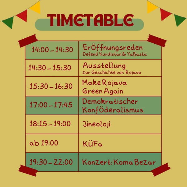 Angeboten werden Workshops zu der Kampagne Make Rojava Green Again, dem Modell „Demokratischer Konföderalismus“, und der aus der kurdischen Frauenbewegung hervorgegangenen „Jineolojî“. Auftakt ist um 14 Uhr, abends tritt die Musikgruppe Koma Bezar auf.