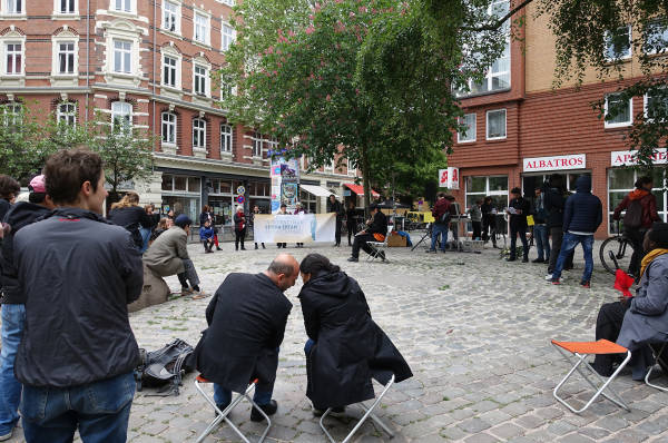 Im Anschluss an die Gedenkreden wurden Blumen an dem Bauzaun niedergelegt, auf dem Bilder und ein Gedenkplakat für Semra Ertan hingen. Dann wurde ein Trauerzug zum Jaja-Diabi-Circle am Park Fiction durchgeführt. Hier war Jaja verhaftet worden.