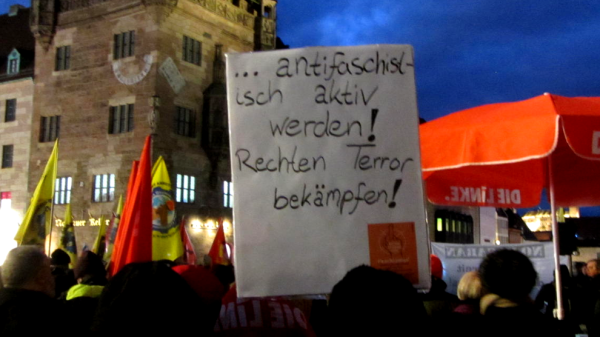 Mehr als 800 Menschen aus zahlreichen Organisationen, Parteien, aber auch Einzelpersonen versammelten sich heute in Nürnberg zu einer spontan einberufenen antifaschistischen Kundgebung gegen den rechten Terror. Nach einer Schweigeminute für die Opfer des Anschlags in Hanau wurden etliche Reden gehalten. Neben der Anteilnahme und dem Mitgefühl für die Hinterbliebenen war die politische Botschaft eindeutig: Der zweitgrößte rechte Anschlag in der Geschichte der Bundesrepublik komme nicht aus dem Nichts. Das faschistische Gedankengut dringt immer mehr in die Gesellschaft ein, Rechtsradikale verstehen sich als militärischer Arm einer völkischen Bewegung, rufen zur Gewalt auf, sie bewaffnen sich und sie schlagen zu. Sie fühlen sich ermuntert durch die AfD und die rechtspopulistische und rassistische Rhetorik aus der „bürgerlichen Mitte“, die durch Leute wie Innenminister Seehofer oder FDP-Chef Christian Lindner den Rechtsruck mitbefördert wird.