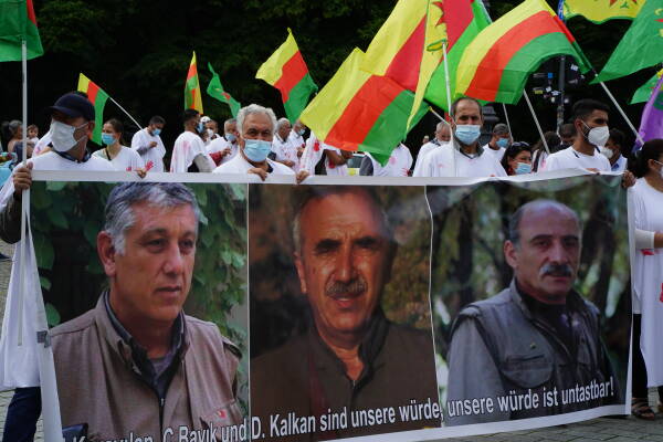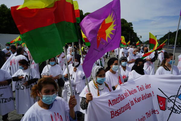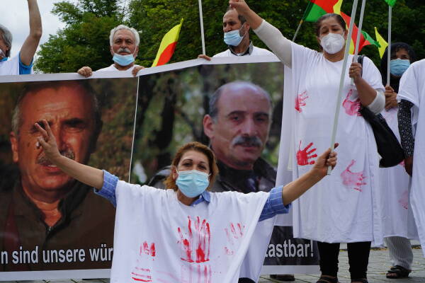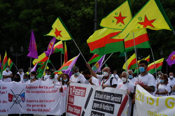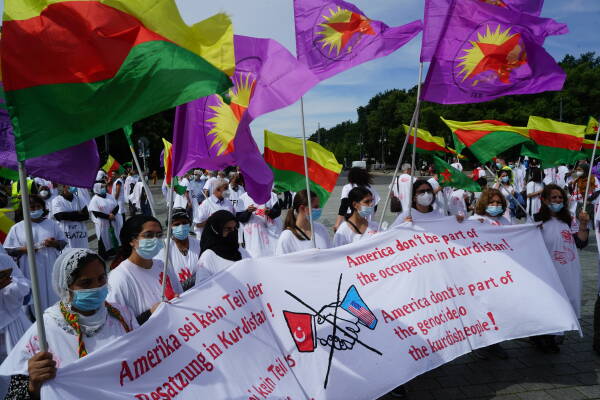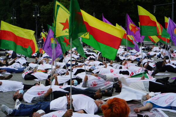 Die Freie Kurdistan Föderation Ostdeutschland e.V. (FED-KURD) hat mit einer Performance vor der US-Botschaft in Berlin gegen die Unterstützung des Erdogan-Regimes bei der völkerrechtswidrigen Besatzung Kurdistans protestiert. Viele der Aktivist:innen trugen als Symbol für den stattfindenden Völkermord weiße Umhänge mit roten Handabdrücken. Auf Transparenten wurden die USA aufgefordert, sich nicht an der Besatzung Kurdistans zu beteiligen. Weitere Inschriften lauteten „No pasaran für die Diktatur Erdogans“, „Die Zeit ist gekommen: Freiheit für Öcalan!” und „Gemeinsam gegen Faschismus und Besatzung aufstehen, zusammen Kurdistan verteidigen!”.