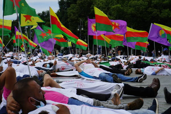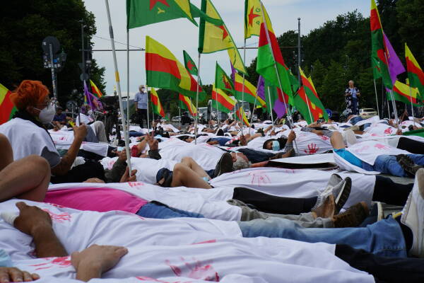 Nach der Auftaktrede legten sich die Aktivist:innen auf den Boden und standen nach fünf Minuten mit der Parole „Bijî Serok Apo“ wieder auf. Die Ko-Vorsitzende des kurdischen Europaverbands KCDK-E, Fatoş Göksungur, teilte in einem Redebeitrag mit, dass zeitgleich auch in Paris gegen die Haltung der USA und anderer NATO-Staaten protestiert wird: „Wir werden massakriert und die ganze Welt sieht diesem Völkermord zu. Als Kurdinnen und Kurden schweigen wir nicht zu Besatzung und Völkermord.“