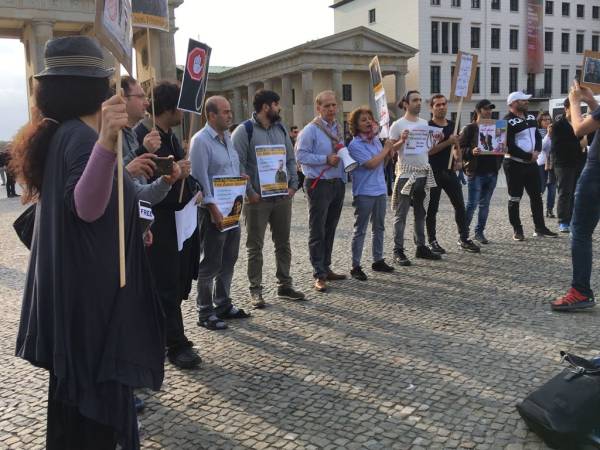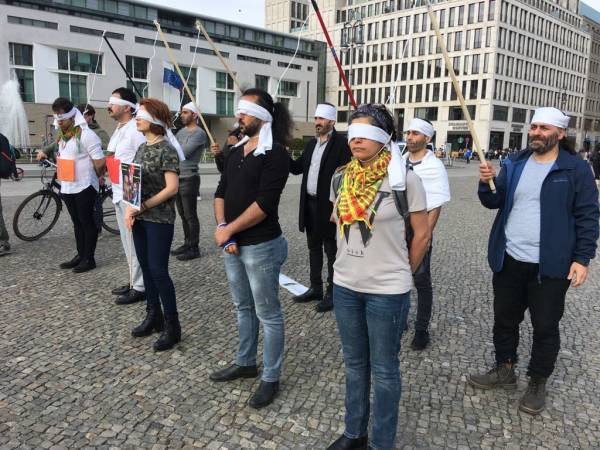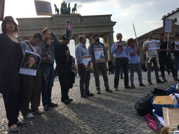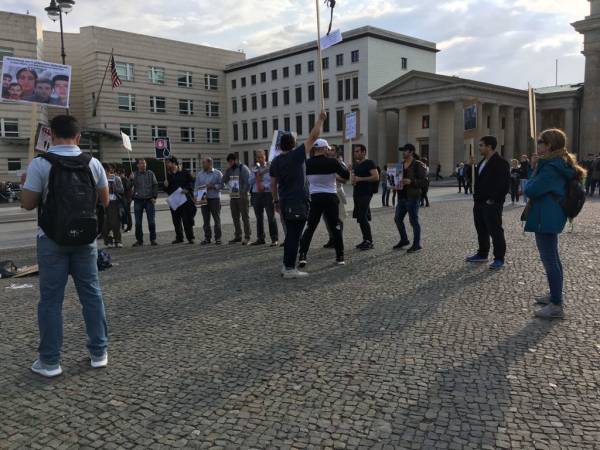 Auf dem Platz vor dem Brandenburger Tor führte NAV-Dem Berlin gemeinsam mit einer Gruppe Aktivist*innen eine Protestaktion unter dem Motto „Stoppt den Staatsterror des iranischen Staates“ durch. Sie forderten ein sofortiges Ende der Hinrichtungen im Iran. Die Protestierenden trugen Bilder von im Iran hingerichteter kurdischer Politiker*innen und von Hinrichtung bedrohter Gefangener. Auf Plakaten wurde die Freiheit aller politischen Gefangenen in Kurdistan und von Hüseyin Panahi gefordert. Panahi war im Juni 2017 als angebliches Mitglied der linken Widerstandsbewegung Komala gefangen genommen worden, Anfang April war die Todesstrafe gegen Panahi bestätigt worden.