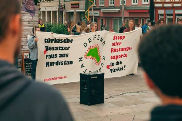 Zwischen den Redebeiträgen wurde gesungen und lautstark die Beendigung der Angriffe gefordert. Weiter forderten die Aktivist:innen: „Das Schweigen der Weltgemeinschaft zu den Angriffen der Türkei, die bereits in den letzten Jahren mehrfach ungestraft das Völkerrecht gebrochen hat – unter anderem durch Attentate auf Politiker:innen, den Einsatz verbotener chemischer Waffen und durch ethnische Säuberungen in besetzten Gebieten, muss beendet werden.“