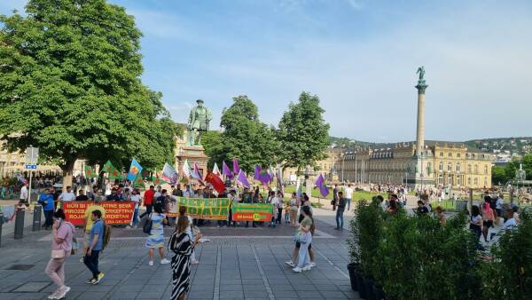 Auch in Stuttgart hatte die Frauenbewegung TJK-E zum Protest aufgerufen. Am Kobanê-Platz (Schlossplatz) versammelten sich die Aktivistinnen und Aktivisten und protestierten lautstark. Immer wieder kam es zu Provokationen türkischer Faschisten, die jedoch aufgrund der Besonnenheit der Teilnehmerinnen und Teilnehmer zu keiner Eskalation führten. Die Parolen „Terrorist Erdoğan“, „Deutschland finanziert, Türkei bombardiert“, „Şehîd namirin“, „Kurdistan wird das Grab des Faschismus sein“ und „Jin Jiyan Azadî“ hallten durch die Stadt.