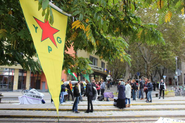 Nach der Veranstaltung fand auf dem Holzmarkt in Jena eine Demonstration statt. Zahlreiche Menschen versammelten sich, um auf die aktuelle Lage in Syrien, insbesondere in Aleppo, aufmerksam zu machen und die Bedeutung eines demokratischen Syriens zu betonen.