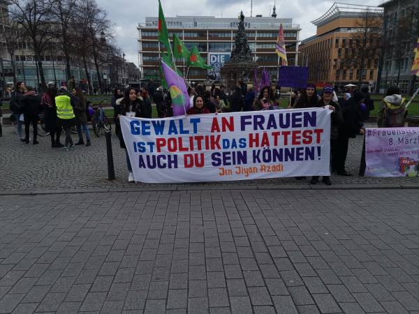In Frankfurt am Main fand eine Demonstration vom Hauptbahnhof zur Hauptwache statt. An der Aktion nahmen die kurdischen Frauenräte aus Frankfurt und Mainz, „Women Defend Rojava“ und viele weitere Gruppen teil. An der Hauptwache ließen die Frauen weiße und lilafarbene Ballons aufsteigen. Am Ende der Veranstaltung kam es zu einer vorübergehenden Ingewahrsamnahme.