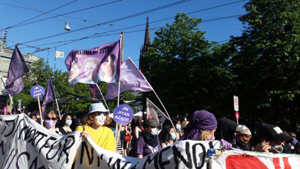 Wir spüren die direkten Folgen von Krieg, Zerstörung und Macht nicht nur an unserem Arbeitsplatz, oder auf unseren Körper, sondern vor allem auch auf unsere Umwelt und die Natur weltweit ... Als kurdische Frauen in der Schweiz haben wir heute mehr als einen Grund zu streiken. Es sind die Folgen von jahrelanger Zerstörung, Ausbeutung und Vertreibung, die nicht zu lassen, dass wir unsere kurdische Erde gegen die fortlaufenden Angriffe des Türkischen Staates und der NATO direkt vor Ort verteidigen, deswegen streiken wir heute hier mit euch allen gemeinsam.