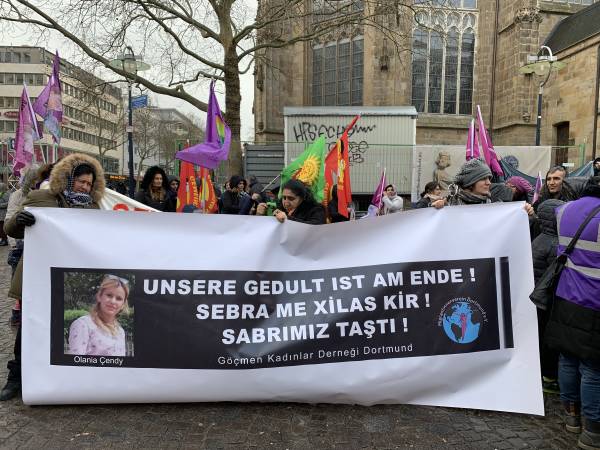 Zahlreiche kurdische und internationale Frauenverbände haben sich heute aus diesem Anlass in Dortmund versammelt und protestierten gemeinsam mit Familienangehörigen gegen den Mord an Olania Çendy und gegen Frauenmorde weltweit. Erschienen waren die Demonstrierenden mit unterschiedlichen Transparenten und Flaggen. Sie riefen Parolen wie „Alle zusammen gegen Frauenmorde“, „Jin Jiyan Azadî“. Auch afrikanische Frauenorganisationen sowie die Antifa nahmen an der Demonstration teil.