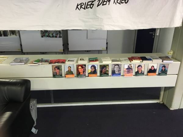 Im Rahmen der Ausstellung „Frühling der Frauen“ an der Freien Universität Berlin hat eine Soli-Gruppe aus Studierenden ein Büchercafê veranstaltet, um Interessierte zu informieren und ins Gespräch zu kommen.