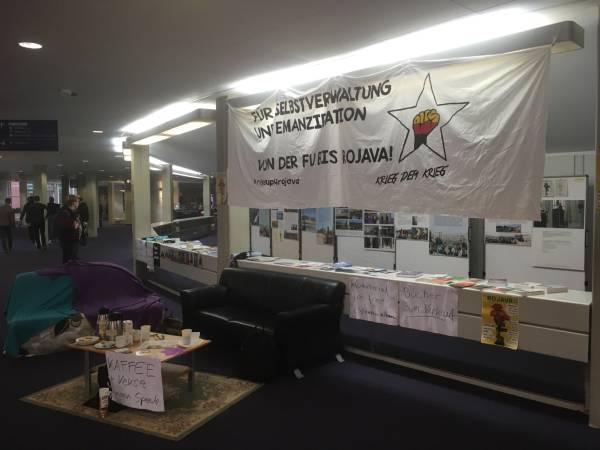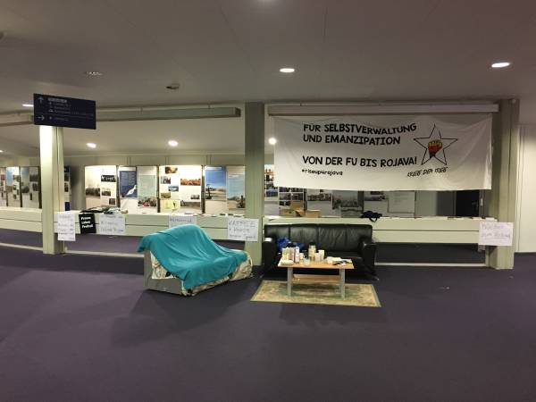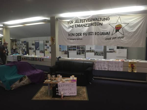 Seit zwei Wochen steht die Ausstellung „Frühling der Frauen“ von WJAR, der Freien Frauenstiftung Syrien (ehemals „Stiftung der freien Frau in Rojava“) im Hauptgebäude der Freien Universität in Berlin. Organisiert wird die Ausstellung von einer Soli-Gruppe aus Studierenden der Hochschule. In dieser Woche wurde im Rahmen der Ausstellung zudem ein kleines „Büchercafé“ veranstaltet. Zwei Sofas wurden dafür im Hauptgebäude aufgestellt, dazu ein Transparent mit der Aufschrift „Für Selbstverwaltung und Emanzipation – von der FU bis Rojava - #riseup4rojava – Krieg dem Krieg“.
