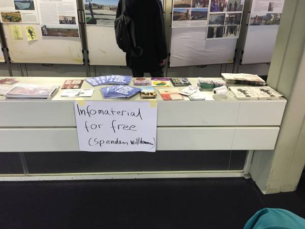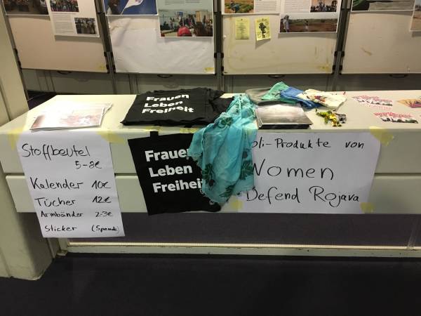 Neben Kaffee und Keksen konnten sich Interessierte Bücher zum Thema Rojava aus dem Buchladen „Schwarze Risse“ anschauen und kaufen, außerdem lag eine Menge an Informationsmaterial, Stickern und Plakaten aus. Es wurden Soli-Produkte von „Women Defend Rojava“, einem Aktionskomitee, das ähnlich wie #RiseUpforRojava weltweit gegen den Angriffskrieg der Türkei auf Nord- und Ostsyrien agiert, angeboten und Spendenbecher aufgestellt. Das Angebot wurde von den Menschen an der Universität gut aufgenommen, viele schauten sich die Sachen an, kauften Produkte und spendeten. Ein Teach-In vor dem Mensafoyer und ein Vortrag von Women Defend Rojava fand ebenfalls statt, um Interessierte zu informieren und ins Gespräch zu kommen.