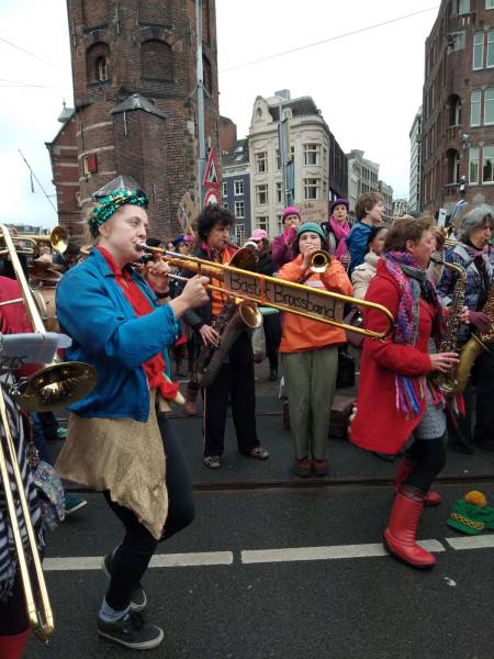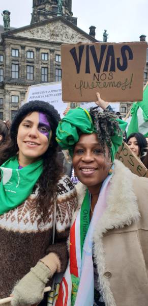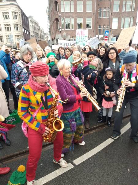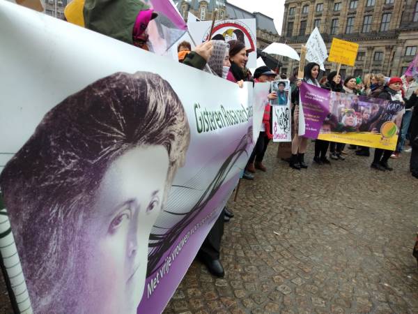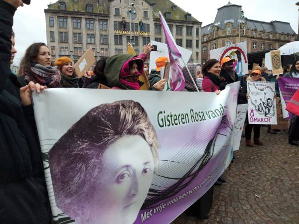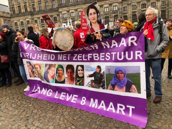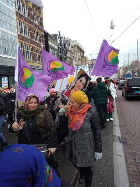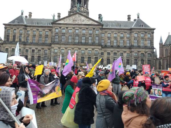 An einer Demonstration in Amsterdam nahmen kurdische, argentinische, philippinische, iranische und niederländische Frauen teil. Die Frauen trugen Bilder von ermordeten Politikerinnen und Revolutionärinnen wie Sakine Cansız und Hevrîn Xelef.