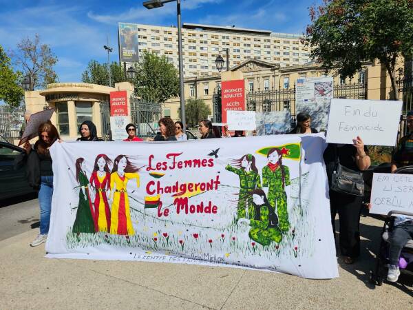 In der auf Französisch, Kurdisch und Türkisch vorgetragenen Erklärung hieß es: „Das männliche Herrschaftssystem setzt den Feminizid fort. In Marseille wurde eine Frau am 26. September von ihrem Expartner S.A. durch sieben Messerstiche schwer verletzt. Er wollte unsere Freundin ermorden. Als Frauen finden wir uns nicht mit der Herrschaft über unsere Körper und unseren Willen ab. Niemand darf gegen unseren Willen intervenieren. Wir verurteilen alle Angriffe auf den Körper, die Persönlichkeit, den Willen und das Leben von Frauen und werden den juristischen Prozess verfolgen, damit der Täter die Höchststrafe erhält. Als Frauenrat Arîn Mîrkan kämpfen wir gegen alle Formen des Feminizids. Wir organisieren unsere Selbstverteidigung gegen das männliche Herrschaftssystem, das Frauen das Recht auf Leben abspricht. Als Kurdinnen kämpfen wir überall gegen die IS-Mentalität, in unserem Zuhause, auf der Straße, bei der Arbeit. Wir wissen, dass das patriarchale System angesichts der stärker werdenden Kämpfe von Frauen Wut und Angst hat. Im 21. Jahrhundert heißt der Frauenkampf Jin-Jiyan-Azadî. Dabei handelt es sich um eine Philosophie, die in Kurdistan, Iran und Afghanistan immer stärker wird. Als Kurdinnen sagen wir: Mit Jin-Jiyan-Azadî zur Frauenrevolution!“