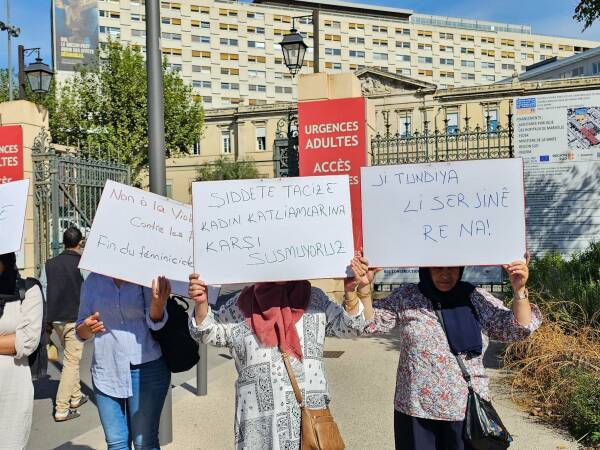 In Marseille ist eine Frau von ihrem Expartner S.A. niedergestochen worden. Die Frau wurde am Dienstag mit sieben Stichwunden lebensgefährlich verletzt und befindet sich auf der Intensivstation. Der Frauenrat Arîn Mîrkan hat am Donnerstag vor dem Krankenhaus La Timon gegen Feminizide protestiert. Die Aktivistinnen trugen ein Transparent und Schilder mit der Aufschrift „Frauen werden die Welt verändern“, „Gewalt gegen Frauen ist politisch“ und „Jin Jiyan Azadî“ und machten in einer Erklärung deutlich, Feminizide nicht hinzunehmen.