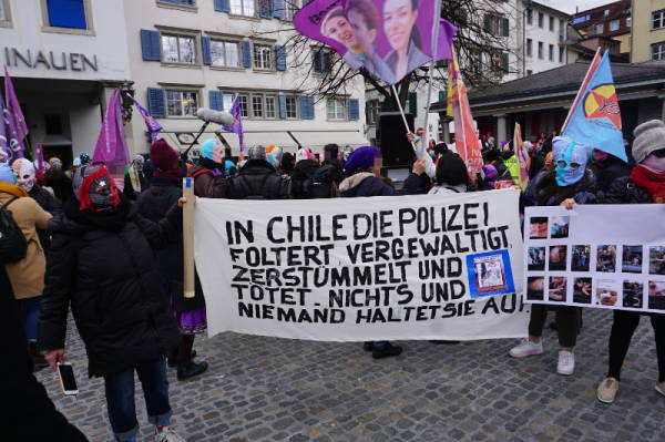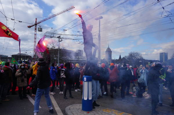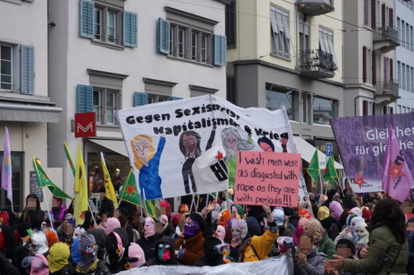„Unter der Parole ‚Die Wut organisieren – Frauen*solidarität jetzt‘ riefen wir kämpferisch dazu auf, trotz massiver Repression unseren Kampf gegen das Patriarchat auf die Straße zu tragen. Bereits nach kurzem zeigte sich, wie unbequem die Anliegen von uns Frauen anscheinend sind. Wir konnten erneut nicht unsere traditionelle Route Richtung Fraumünster und Paradeplatz laufen, obschon wir uns diese über die ganzen letzten 30 Jahre jedes Jahr erkämpft haben. So zogen wir immer wütender Richtung Central, wo wir zu einer Blockade aufriefen, statt die vorgegebene und von Bullen angeführte Route auf Nebenstraßen abzulaufen. So war unsere Blockade die einzige Möglichkeit des Widerstandes gegen das repressive Diktat des Staates. Wir waren auf diese Situation gut vorbereitet und nutzten die Zeit für Reden, Tanz, Stadtverschönerungen und eine Performance.