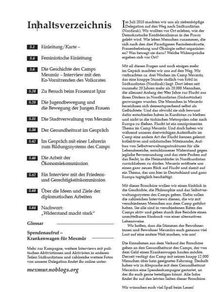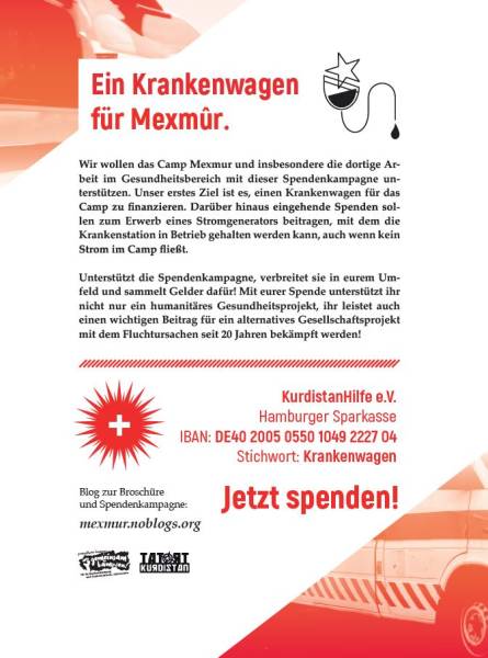 Wir hoffen, dass die Stimmen der Bewohnerinnen und Bewohner Mexmûrs euch genauso viel Lust auf eine andere Welt machen, wie uns! Die Einnahmen aus dem Verkauf der Broschüre gehen an den Gesundheitsrat des Camps, der von dem Geld einen Krankenwagen kaufen möchte. Derzeit verfügt das Camp mit seinen knapp 20.000 Menschen über kein geeignetes Fahrzeug. Deshalb haben wir in Absprache mit dem Gesundheitsrat Mexmûrs eine Spendenkampagne gestartet, an der ihr euch gerne beteiligen könnt. Alle Infos findet ihr auf den letzten Seiten dieser Broschüre.