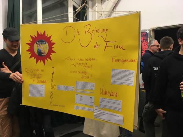 Eine kurze Einführung in die Arbeiten der Filmkommune Rojava gab ein Mitglied des Hamburger Avakino Filmkollektivs. Daraufhin wurde „Berfîn“ gezeigt und anschließend in mehreren kleineren Gesprächsrunden ausführlich diskutiert. Der Spielfilm kam bei den Jugendlichen sehr gut an, insbesondere im Gespräch wurde dann auch der politische und gesellschaftliche Kontext intensiv besprochen. Es wurden viele Fragen gestellt, insbesondere dem Alltag in der Guerilla wurde hohes Interesse entgegengebracht.