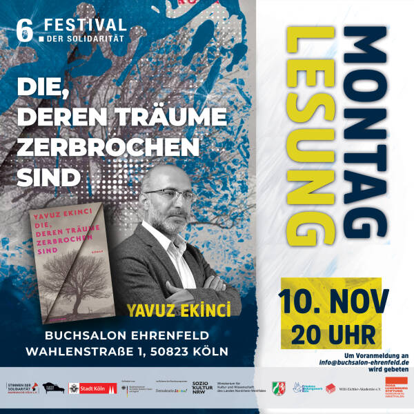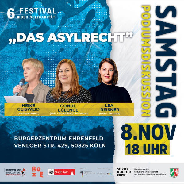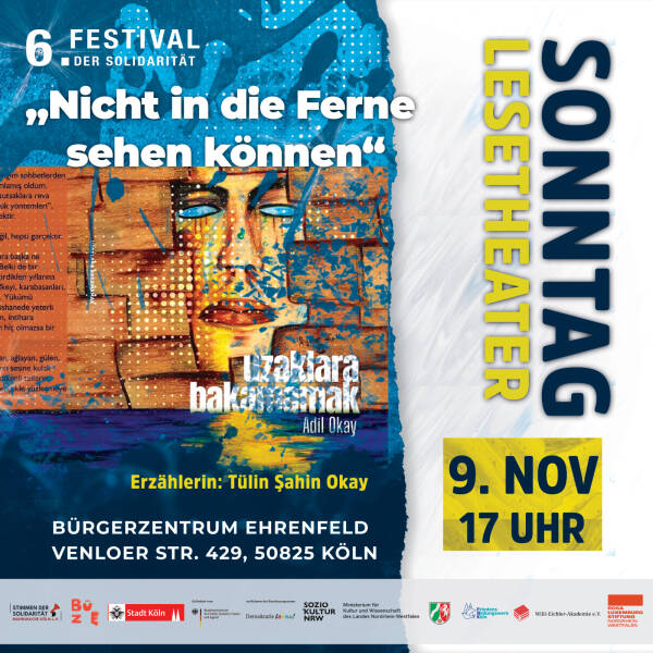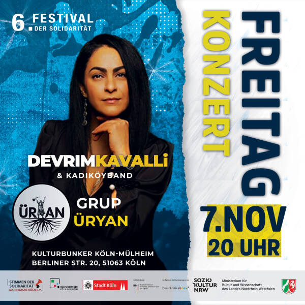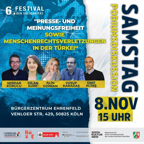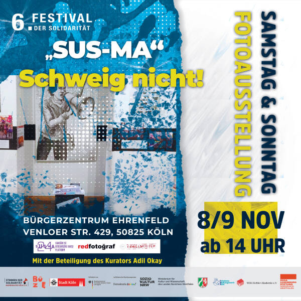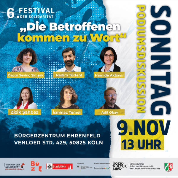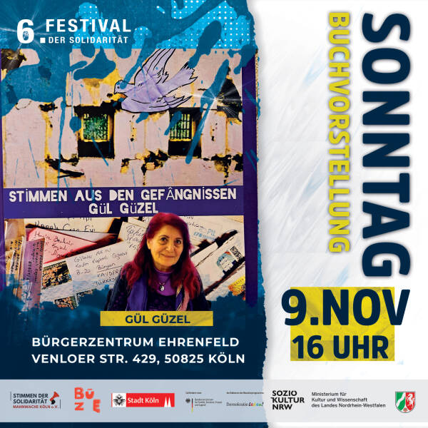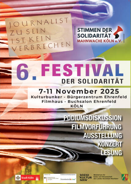 Zum mittlerweile sechsten Mal organisiert der Kölner Menschenrechtsverein „Stimmen der Solidarität“ das Festival der Solidarität. Es soll vom 7. bis zum 11. November mit Unterstützung der Stadt Köln, des Kultusministeriums des Landes Nordrhein-Westfalen, des Bundesministeriums für Bildung, Familie, Senioren, Frauen und Jugend (BMBFSFJ) sowie der Willi-Eichler-Akademie, des Friedensbildungswerks und der Rosa-Luxemburg-Stiftung stattfinden. Die Veranstaltungen werden in Zusammenarbeit mit dem Kulturbunker Köln, dem Bürgerzentrum Ehrenfeld, dem Buchsalon Ehrenfeld und dem Filmhaus durchgeführt.