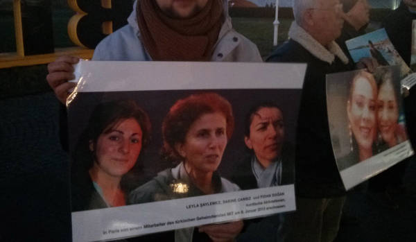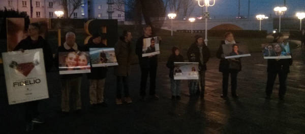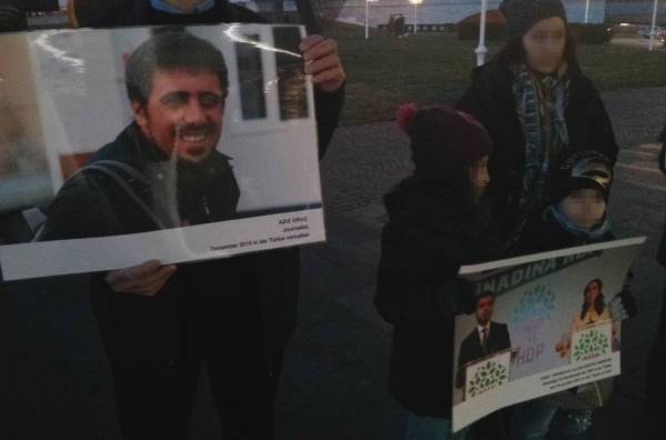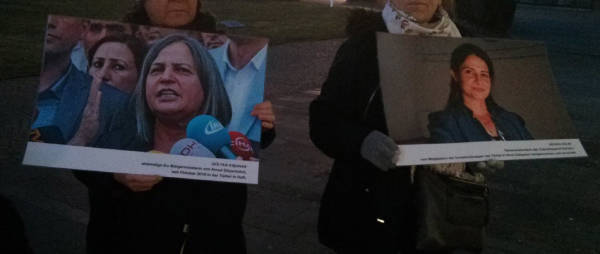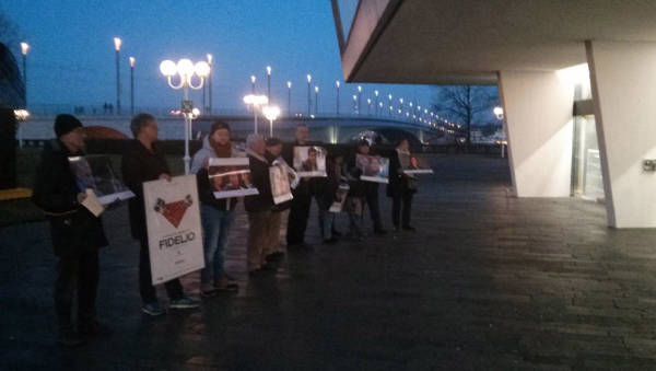 Dieser Anlass bot einigen Aktivistinnen und Aktivisten die Gelegenheit zu einer Mahnwache vor Beginn der Oper, um die Besucher*innen mit zusätzlichen Informationen zu versorgen. Es wurden acht Fototafeln gezeigt, auf denen stellvertretend zwölf Personen abgebildet waren, die entweder in der Türkei im Gefängnis sitzen oder durch die Politik des türkischen Staats ermordet wurden: Hevrîn Xelef, Figen Yüksekdağ und Selahattin Demirtaş, Gültan Kışanak, Sakine Cansız, Fidan Doğan und Leyla Şaylemez, Aziz Oruç, Hozan Canê und Gönül Örs, Abdullah Ahmed al-Sayil sowie Yılmaz Çelik. Dazu wurde ein Flugblatt verteilt unter der Überschrift „Demokratie hinter Gittern – Demokratie unter Beschuss. Den Krieg des türkischen Staates gegen die Demokratie beenden!“, in dem über die Repression in der Türkei und die Ziele des türkischen Staates in Rojava informiert wird. Zum Abschluss wird dazu aufgerufen, Druck auf die Bundesregierung auszuüben, „damit sie endlich jegliche wirtschaftliche Unterstützung und Kooperation mit der Türkei beendet“.