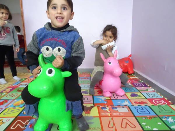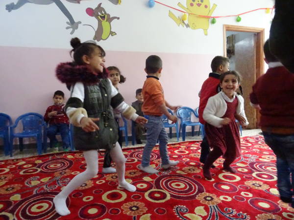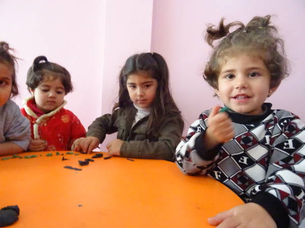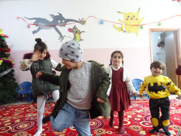 In drei gemütlichen Gruppenräumen sind die Kinder nach Altersgruppen bis 13.00 Uhr betreut. Die Dreijährigen sitzen an den runden orangen Tischen und kneten, die Vierjährigen singen Lieder und in der Gruppe der Fünfjährigen wird gerade das kurdische Alphabet gelernt. Eine große Gruppe tanzt gerade im Saal zu lauter Musik. Hier steht auch immer noch ein Weihnachtsbaum.