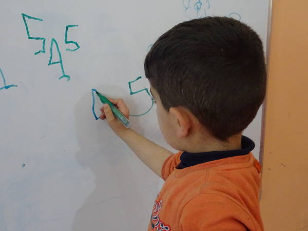 Hezdar berichtet, dass die Fünfjährigen sich schon langsam auf die Schule vorbereiten, die im Spätsommer beginnt. Auch die Dreijährigen lernen schon Stifte zu verwenden.